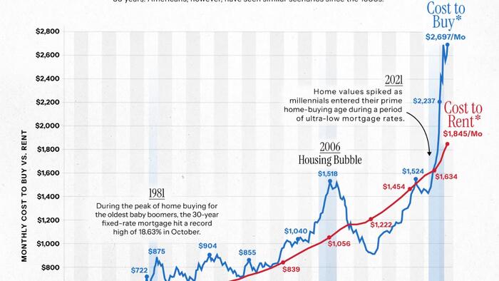 As a result, the median rent in America is approximately $1,850 per month, about 30% cheaper than the median cost to buy, standing at $2,700 per month. This gap represents the largest difference between renting and buying in U.S. history.
