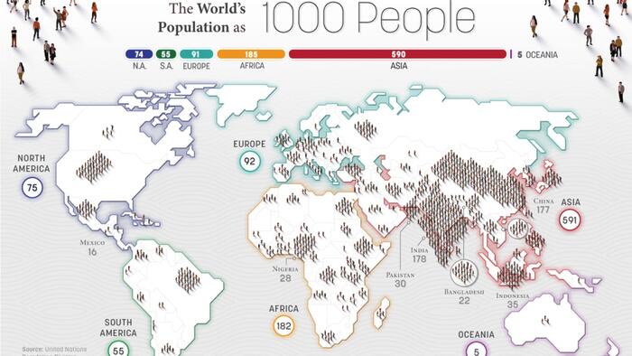 If the world only had 1,000 people, North America would have only 75 inhabitants, with 42 in the United States. Meanwhile, South America would account for 55 people led by 27 from Brazil, and Oceania would have just 5 people (with 3 in Australia).