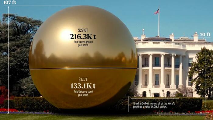 For investors, that mix of finite physical supply, ongoing central-bank purchases, and rising investment demand helps explain why this 107-foot sphere of gold now represents more than $47 trillion in combined above- and below-ground value at current prices.
