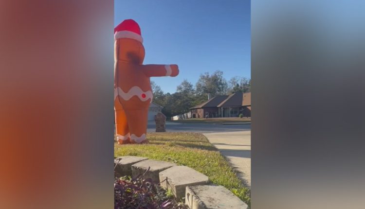 In a video that made the rounds on social media, the gingerbread man decoration is seen inflated in the front yard, when a white cargo van pulls up.
