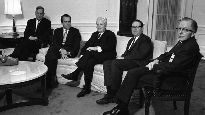 President Richard Nixon (2nd-L) poses at the White House in Washington, with four government officials he named as his economic “Quadriad” on Jan. 23, 1969. (L-R) Chairman William M. Chesney Martin Jr., of the Federal Reserve Board; Nixon; Secretary of the Treasury David M. Kennedy; Budget Director Robert Mayor and Chairman Paul McCracken of the Council of Economic Advisers. AP Photo/ Harvey Georges