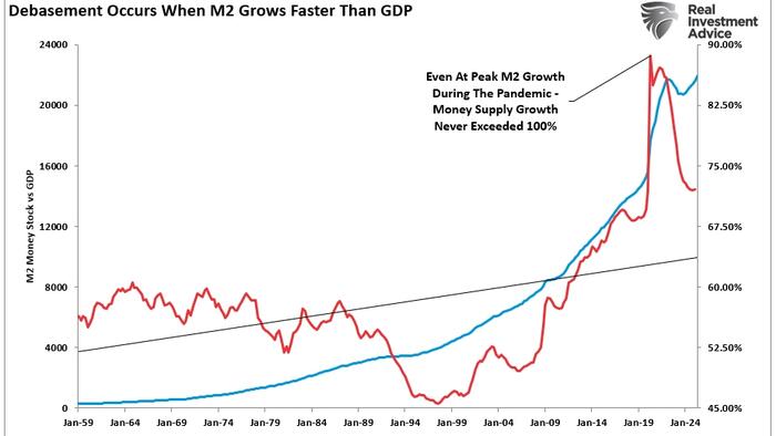 It’s easy to point to M2 charts and scream “debasement. “ However, the money supply must grow as the economy grows. If it doesn’t, deflationary risks emerge. Therefore, the key is whether money creation exceeds economic growth in a sustained way. Since 1959, the money supply has grown in alignment with economic growth.”