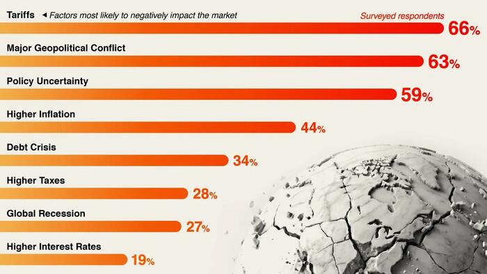 Concerns such as debt crises (34%), higher taxes (28%), and global recessions (27%) still rank meaningfully, though below headline geopolitical risks.