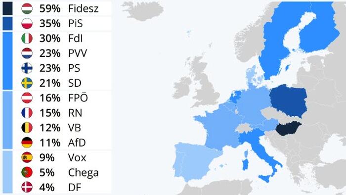 In Austria, the FPÖ came to power in 2017, but after a sharp decline in the 2019 elections, the party now accounts for just 16 percent (down from 28 percent in 2017), a share similar to that achieved by the Rassemblement National after its historic 2022 legislative result in France.