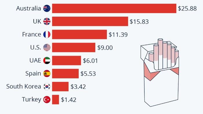There, they could get almost an entire pack of cancer sticks for the price of one, meaning that Australians pay about as much for a single smoke as people in Turkey do for a whole pack.