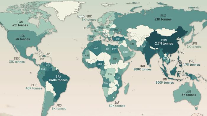| Rank | Country | Tonnes (2010-2019) |