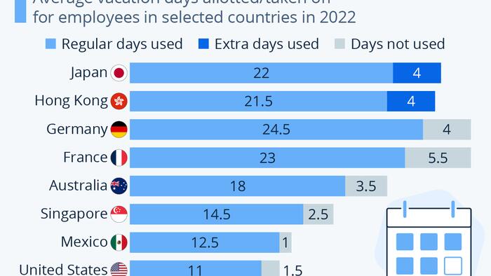Some countries such as the United States rank towards the bottom of the list when it comes to the average number of vacation days allotted (and at its very bottom when looking at statutory leave with 0 days guaranteed). Despite this, the average American worker still leaves vacation days on the table, albeit just few at an average of 1.5. A more workaholic nation in Asia is Singapore, with 17 days allotted on average and an average of 2.5 unused days. Germany and French people have more unused days on average at four and 5.5, respectively. In these two countries, average vacation days allotted per year are also more numerous, however, at 28.5 each. Guaranteed by law are 20 days in Germany and 25 in France. In the U.S., Germany and France, between 10 and 14 public holidays are added to the vacation day tally as well. In Japan, this number is even higher at 16 days.