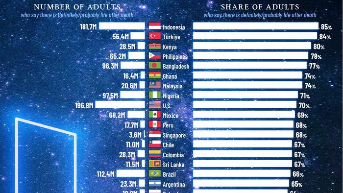Below, we compare how adults view the afterlife based on surveys conducted in 2023 and 2024, with these countries covering a combined population of four billion: