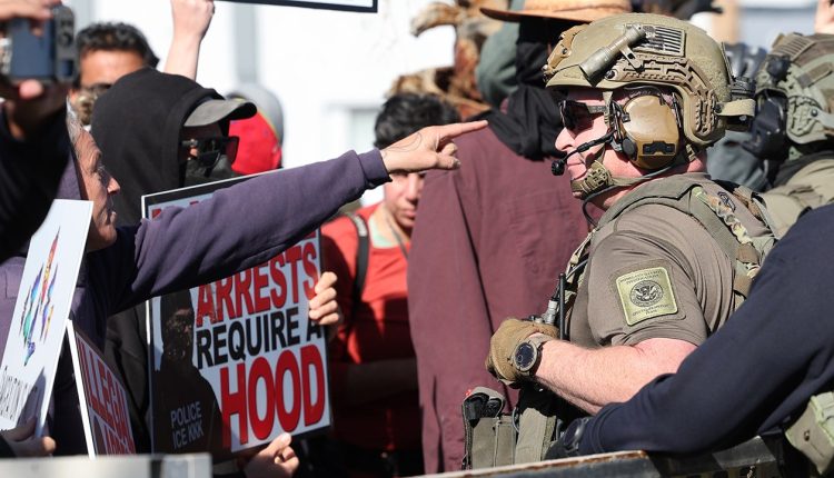 Many of them were carrying identical signs, reading, “illegal arrests require a hood.” One protester was seen shoving a finger in an agent’s face, standing behind a steel barricade.