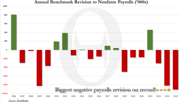 What is more remarkable about today’s print is that after last year’s stunning 818K negative revision, which was the second biggest since the global financial crisis (and which we also warned ahead of time was coming), virtually nobody expected this year’s number to be higher. It was not only higher, but it was the biggest negative revision on record!