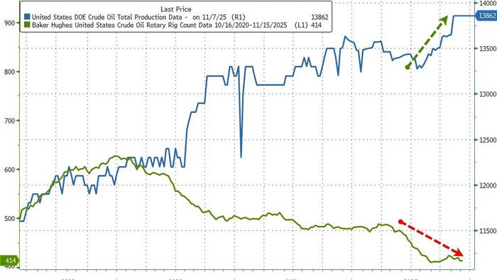 US Crude production surged by over 200k b/d last week to a new record high despite the ongoing slide in the rig count…