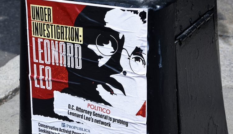 Accountable.US, meanwhile, launched a campaign drawing attention to the Leo investigation. The group plastered signs near the D.C. headquarters of the Federalist Society, a conservative judicial group that Leo co-chairs. They also projected a graphic onto the building.