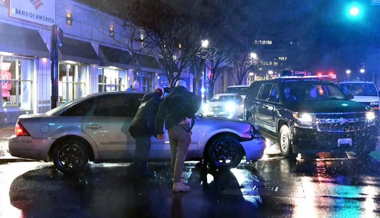 The crash happened Sunday evening when the sedan hit a U.S. Secret Service vehicle being used to close off intersections as Biden was walking from the campaign office to his waiting armored SUV.
