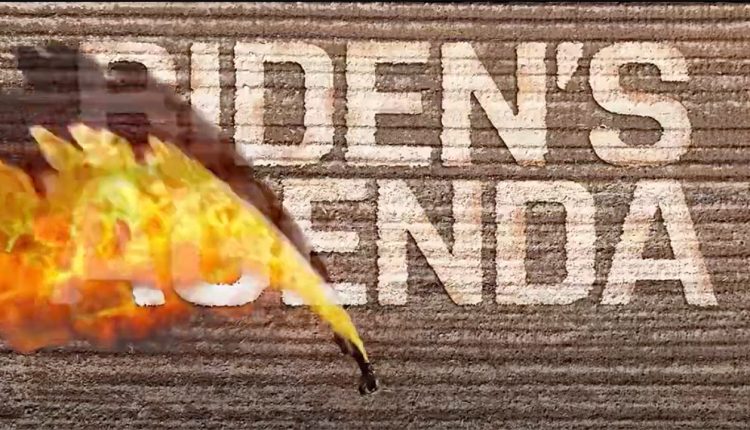 Antani, who is the “youngest currently serving member” of the Ohio state senate, speaks while a flamethrower casts flames onto “Biden’s agenda” in a field.