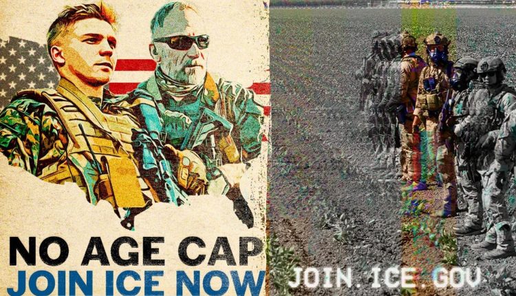 Another ad says, “No age cap. Join ICE now” and features two men in camouflage and tactical-style vests, one appearing significantly older than the other.