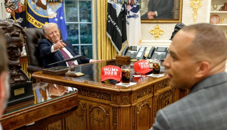 President Donald Trump shared photos on Truth Social on Tuesday showing red “Trump 2028” hats strategically displayed on the Resolute Desk during an Oval Office meeting with Democrat leaders Monday in hopes of fending off a government shutdown.