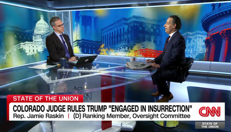 On CNN’s State of the Union with Jake Tapper, former January 6 Select Committee member Rep. Jamie Raskin reacts to a Colorado judge ruling that Donald Trump “engaged in an insurrection.”