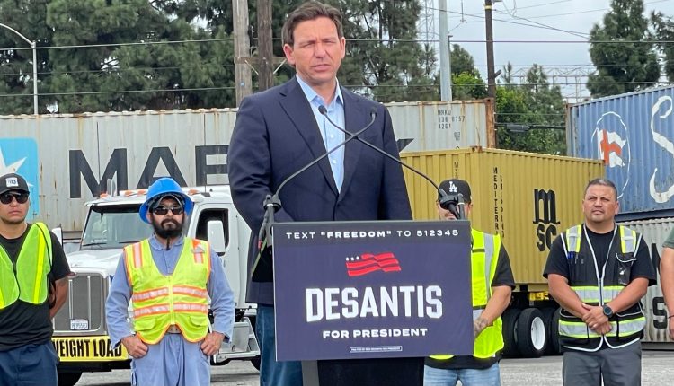 While DeSantis was holding a campaign event at the LA Grain Harbor Facility at the Port of Long Beach — where he took aim at Biden and California Gov. Newsom over electric vehicle mandates in the Golden State — Trump was a few miles away in Anaheim adddress the California GOP’s annual fall convention.