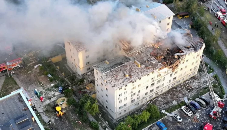 Video footage of the aftermath released by local authorities shows a residential building where the upper levels collapsed, with firefighters hosing it down as smoke rises from the rubble.