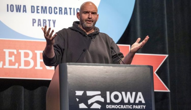 As he sought to rally his fellow Democrats in the Midwest, Sen. John Fetterman on Saturday brought his Pennsylvania brashness to the state that bills itself as “Iowa nice” and roasted the 2024 Republican presidential field.