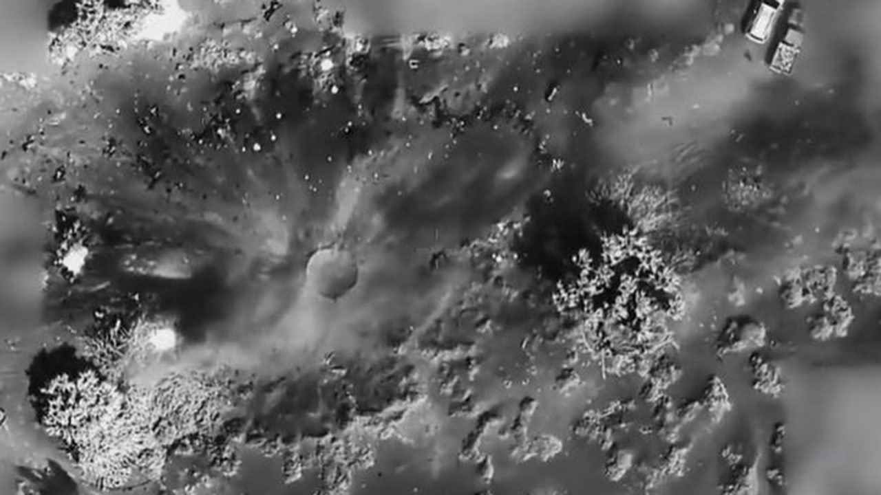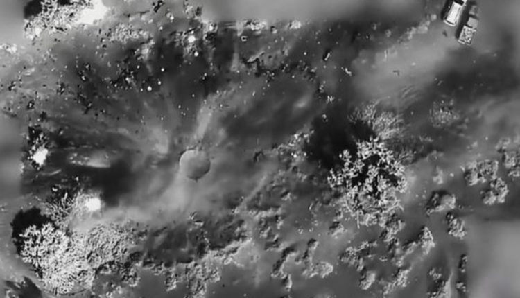 The black and white aerial footage appeared to show a group assembling before a massive blast leaves nothing but a crater.