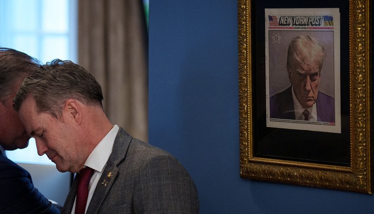 A copy of a New York Post front page featuring President Donald Trump’s mugshot was spotted hanging in an ornate gold frame near the Oval Office in the White House during a news conference this week.