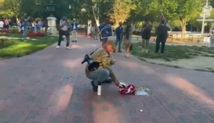 “I am a 20-year veteran of the United States Army,” the man says as the flag burns at his feet. “It is our First Amendment right to burn this flag, regardless of what the president says.”