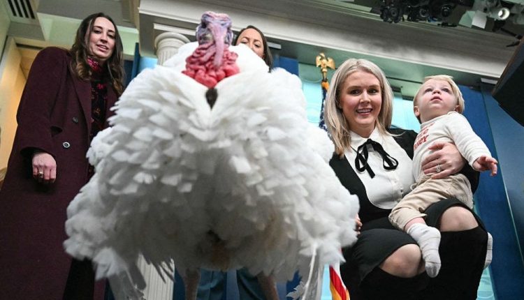 White House press secretary Karoline Leavitt introduced “Waddle” the turkey to reporters in the briefing room before President Donald Trump is scheduled to pardon him and his friend, “Gobble,” on Tuesday.
