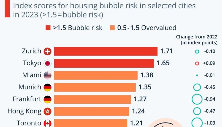 The global risk of housing bubbles has decreased sharply in 2023. A report released Wednesday by Swiss bank UBS concludes that out of 25 cities surveyed, only two were at risk of a housing bubble this year, down from nine each in the previous two reports. The data shows that even places known for their chronically high prices of housing exited bubble territory and were now merely classified as overpriced, including Tel Aviv, Hong Kong, Frankfurt and Toronto.