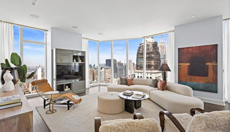 At this residence with a semi-private elevator, floor-to-ceiling glass walls deliver 360-degree city views 24/7. The home’s 32-foot corner great room with 10-foot ceilings looks out on landmarks like the Empire State Building, Chrysler Building, Flatiron Building, clock tower at 1 Madison Avenue, Hudson River and more. The open-plan design of the room consists of a living room that flows to the dining area and the kitchen, which showcases custom cabinetry designed by Molteni and appliances by Sub-Zero and Miele.