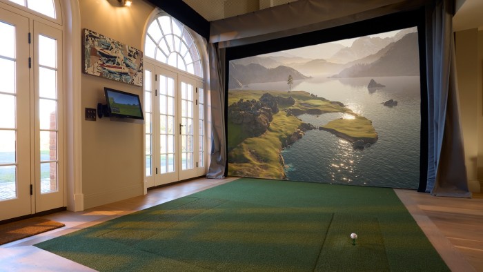 Urban Golf has hosted indoor golf since 2004, firstly in London’s Soho, then a couple of miles up the road in Smithfield, and since 2012 in New York as well. But today, as the technology gets better and cheaper, players are craving home installations. A typical set-up comprises a padded screen, on which the gameplay is projected and which absorbs the blow of the ball; a decent projector connected to a PC or laptop running the simulator software; and, crucially, the tracking unit that analyses the ball’s movement in the split second that it’s airborne. In this particular case it’s a ceiling-mounted, soundbar-sized device called the 3Trak made by US-based aboutGolf (£18,600).